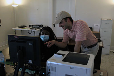 Linton speaking with a student worker.